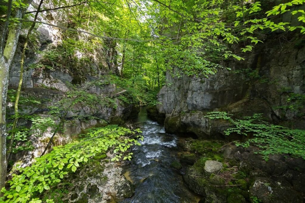 Die Natur in der Taubenlochschlucht ist beeindruckend vielfältig. Moose, Farne und seltene Pflanzenarten bedecken die Felsen, während Vögel und kleine Tiere in den Bäumen leben. Die feuchte Umgebung schafft ideale Bedingungen für ein reiches Ökosystem. Wer genau hinsieht, kann Schmetterlinge, Salamander und manchmal sogar kleine Fische im klaren Wasser entdecken. Dieses Zusammenspiel von Pflanzen und Tieren macht die Wanderung noch spannender.